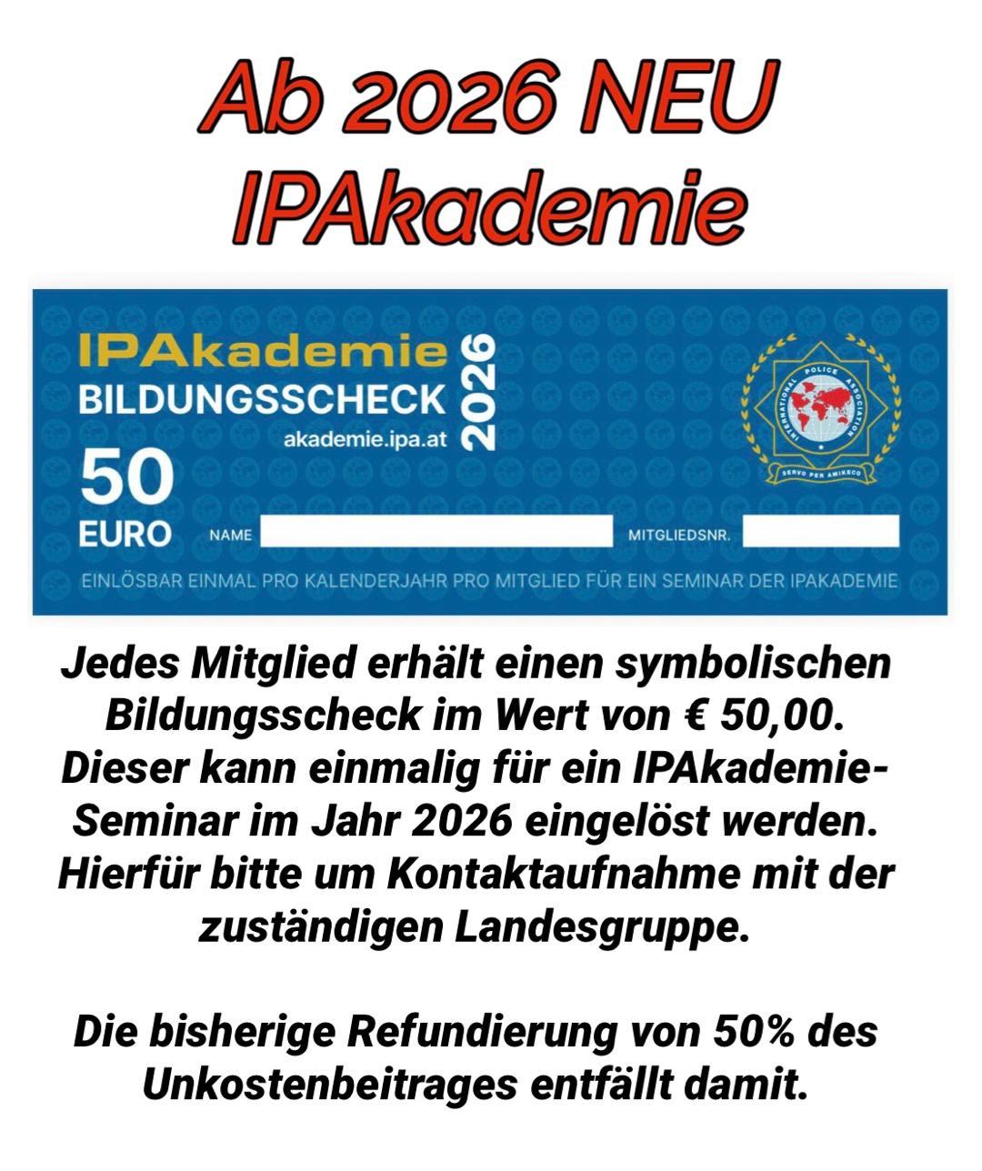 Jedes Mitglied erhält einen symbolischen Bildungsscheck im Wert von € 50,00. Dieser kann einmalig für ein IPAkademie-Seminar im Jahr 2026 eingelöst werden. Hierfür bitte um Kontaktaufnahme mit der zuständigen Landesgruppe.